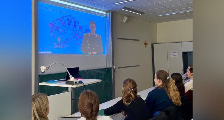 Am 30.10.2025 nahmen die Schülerinnen des Leistungsfaches PuG der 12. Jahrgangsstufe an einem Online-Vortrag des Bundesverteidigungsministeriums teil. Referent war Major Schönowsky, der anschaulich über die